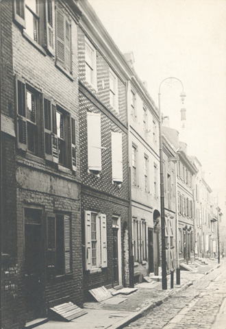 [Row houses along north side of Cherry Street, between 2nd and 3rd Streets, Philadelphia] Photographer’s manuscript note on verso: “The most interesting street from an artistic and colonial viewpoint in Phila. No. side Cherry St. bet. 2” and 3 Sts. Mostly Americans live in this square. Note second house from left. An excellent type of colonial home, in good state of preservation. Flemish bond and ribbon front. Formerly a private school for young ladies. Large rooms. High ceilings.” P.8513.138 |