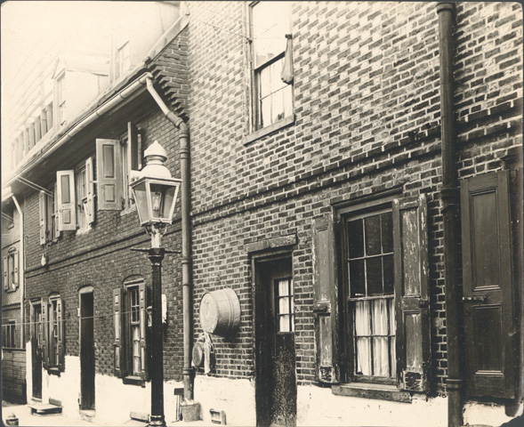 [McKinley's Court, west from 516 North Second Street, Philadelphia]. Photographer’s manuscript note on verso: “McKinleys Court - 2” St. ab ______ St. This is undoubtly [sic] the most picturesque Court in Phila. Note old Flemish bond brickwork. The old community hydrant is there. The old community entrance - to say nothing of the new community lamp post. Cheesebag hanging on window frame of 2” floor window.” P.8513.176 |