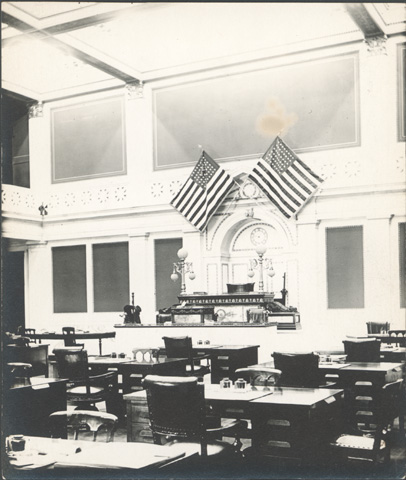 [Philadelphia City Hall, Council Room] Photographer’s manuscript note on verso: “Old Council Chambre. 4” floor City Hall. There are pictures of many past presidents of Council under the balconies on either side of the room. (Find out the names of some of the presidents.)” P.8513.32 |