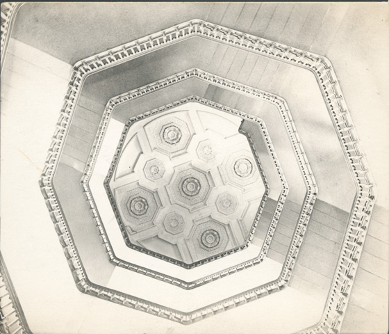 [Philadelphia City Hall, view from below of stairwell] Photographer’s manuscript note on verso: “City Hall: self-supporting stairway, corner towers. Looking directly upward. Stairs of Granite, Banisters of Bronz [sic]. 156 steps.” P.8513.39 |