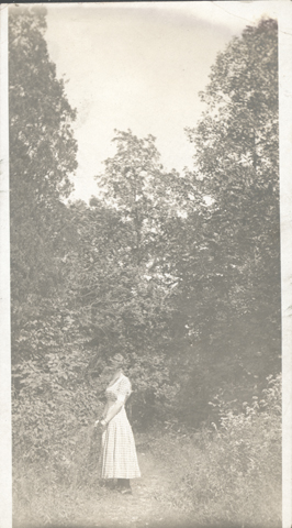 A young miss, a little flower, a winding path and a unique skyline, near Overbrook. Photographer’s manuscript note on verso: “A young miss, a little flower, a winding path and a unique skyline. Near Overbrook. If you are in a big city and without acquaintances, get a camra [sic] or something that looks like one. Wander around looking serious and either taking pictures or appearing to take them; act critically, slowly, and deliberately. If in one Sunday afternoon you do not greet, or are not greeted by at least 10 people, then you are hopeless. Boys if you make a photo such as this, the rest is easy. Obtain the address and send her a print via F.O.B. [Free on Board--shipping is responsibility of buyer] yourself.” P.8513.96 |